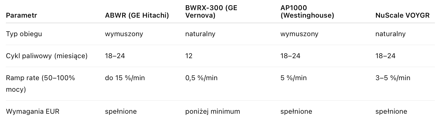 .Powyższe obserwacje prowokują do postawienia co najmniej kilku istotnych pytań. Przede wszystkim należy zapytać, dlaczego w polskiej debacie publicznej rzadko wybrzmiewa reakcja na prezentowanie reaktora BWRX-300 w materiałach reklamowych spółek ORLEN i OSGE jako jednostki „dopasowanej do zmiennych wymagań sieci energetycznej (load following)”. Wiadomo przecież, że wraz ze wzrostem udziału OZE rośnie znaczenie elastyczności źródeł i oferowana przez BWRX-300 prędkość zmiany mocy na poziomie 0,5% na minutę może być niewystarczająca. Taka dynamika nie pozwala na efektywne podążanie za zmianami w systemie elektroenergetycznym ani na skuteczne bilansowanie skokowych wahań generacji. Dla porównania, budowane na Pomorzu reaktory AP1000 w pełni spełniają oczekiwania EUR, oferując zmianę mocy w tempie 5% na minutę (AP1000 NRC DCD), co z zapasem zabezpiecza potrzeby krajowego systemu.